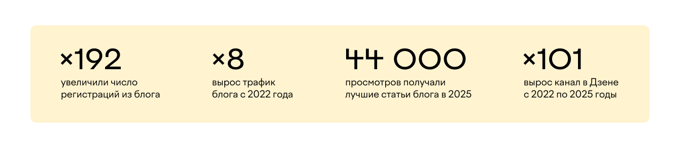 - Наладили приток корпоративных клиентов через блог: начали с 1 регистрации за весь 2022 год и пришли к 192 — в 2025-м.