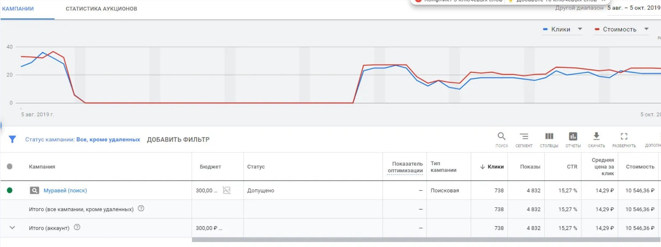 Результаты рекламной кампании в Ads Google за 1 месяц: