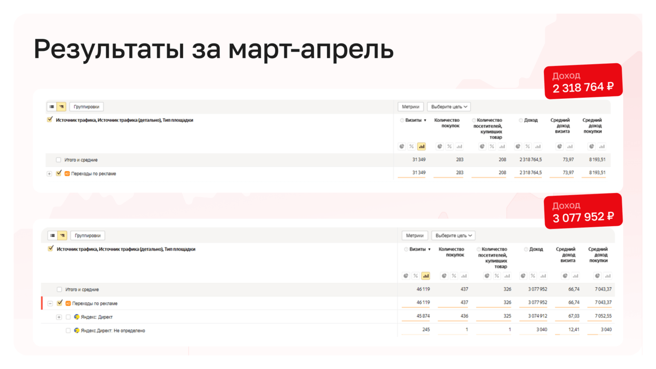 За два месяца работы с увеличенным бюджетом пришли к таким результатам: 3 077 952 рублей при 437 покупках со средним чеком 7043 рублей к концу второго месяца.