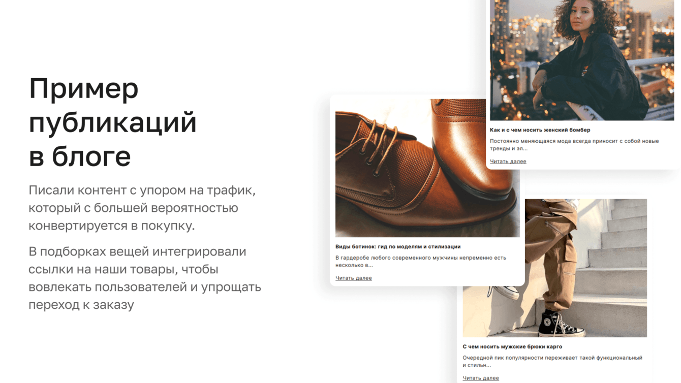 Параллельно начали активно работать с блогом. Подготовили задания для копирайтеров и запустили серию статей, чтобы привлекать информационный трафик и вовлекать пользователей через контент.