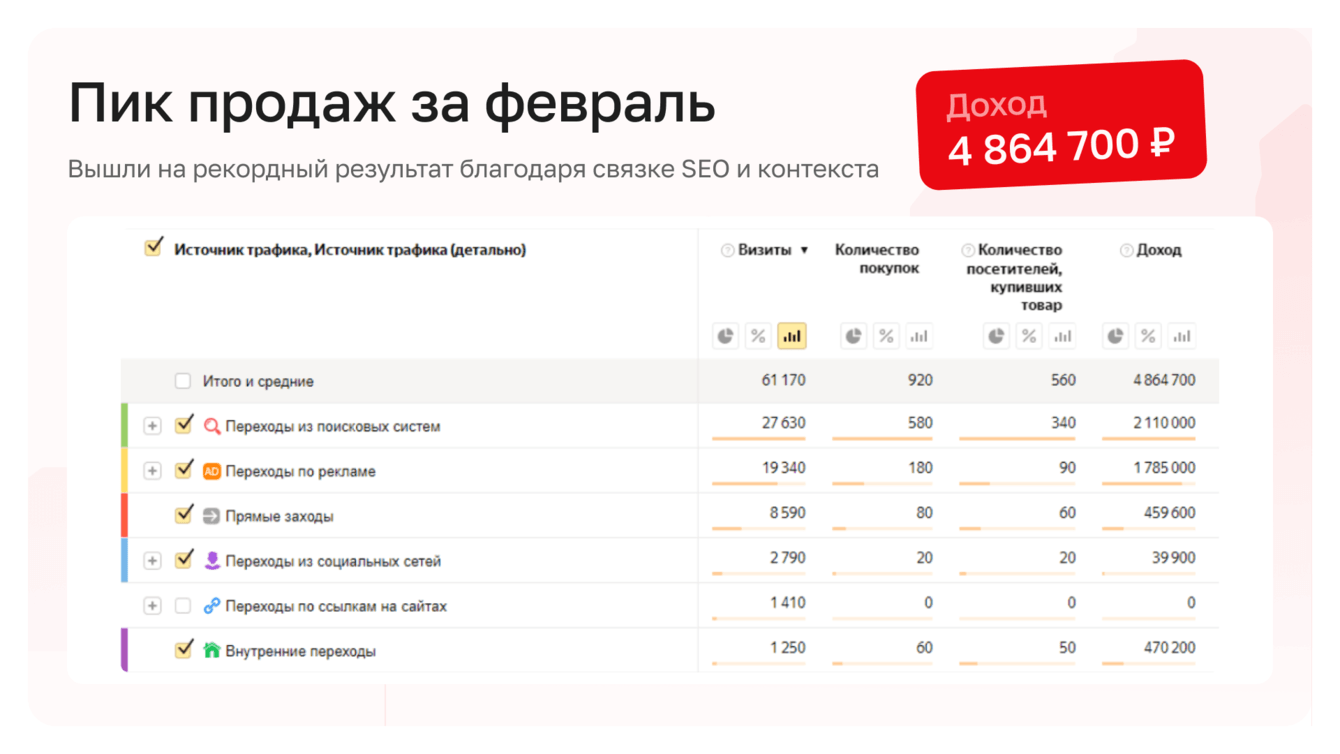 С начала работы в сентябре уже вышли на оборот 4 864 700 рублей в связке SEO и контекстной рекламы.