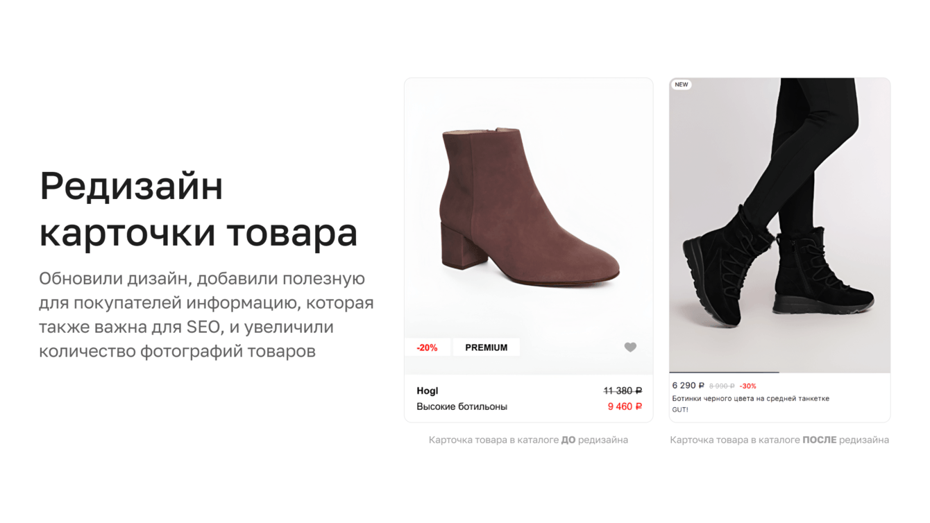 Карточка товара должна закрывать сразу две задачи: быть комфортной для покупателей и полезной для SEO. Мы добавили больше фотографий, чтобы пользователь мог рассмотреть товар — цвет, детали, текстуру.