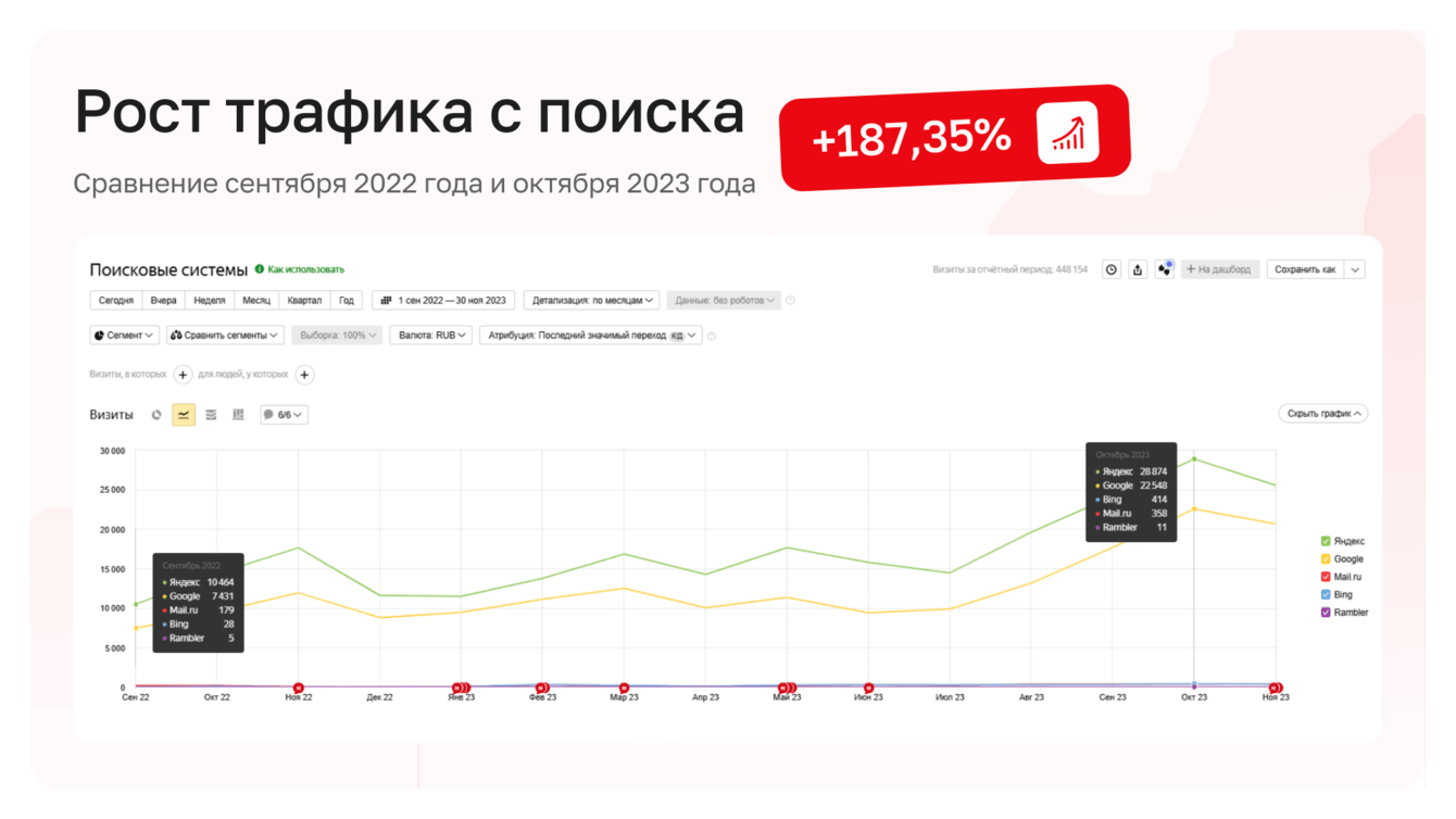 Поэтому мы могли не начинать SEO-продвижение с нуля и показать первые результаты в короткие сроки. И параллельно подключить контекстную рекламу, чтобы усилить эффект от продвижения.