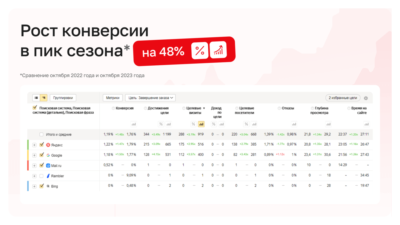 После доработок конверсия с поиска постепенно начала расти. И под пик сезона ее удалось повысить еще на 0,6%.