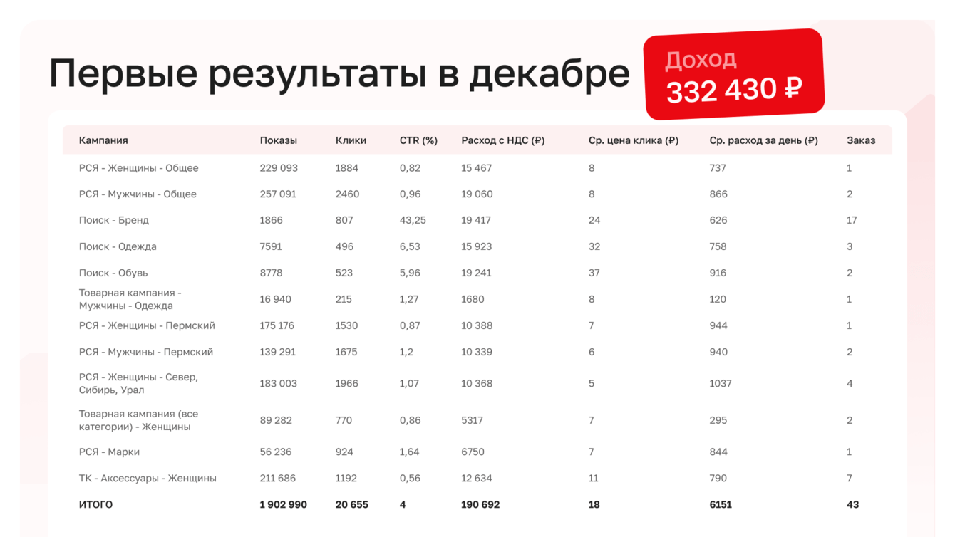 Чтобы рационально использовать рекламный бюджет, сначала сосредоточились на самых целевых и конверсионных сегментах аудитории. Затем, по возможности, подключали более широкие запросы, чтобы приводить других пользователей. За декабрь получили следующие результаты: