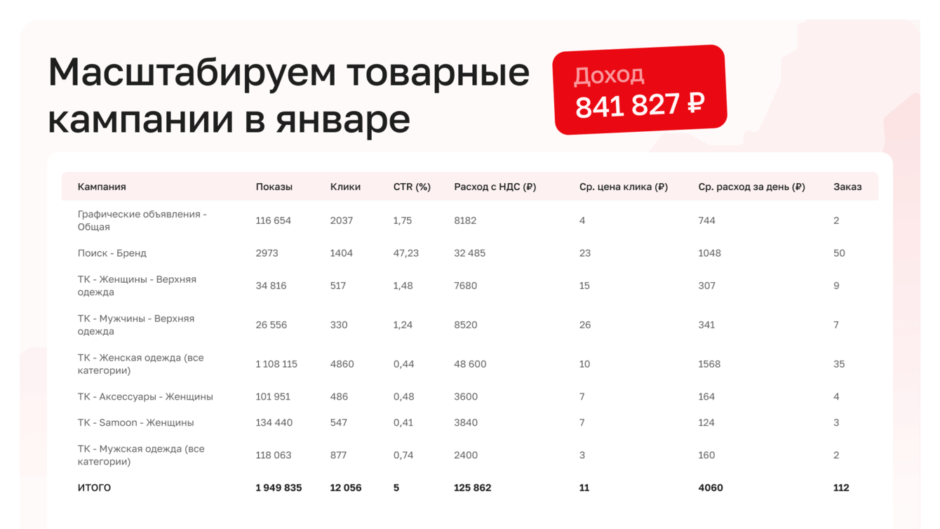 С ростом бюджета в декабре решили расширить направления кампаний, чтобы понять, какие из них принесут лучший результат. Быстро выяснили, что эффективнее всего отрабатывают брендовые запросы и товарные кампании.