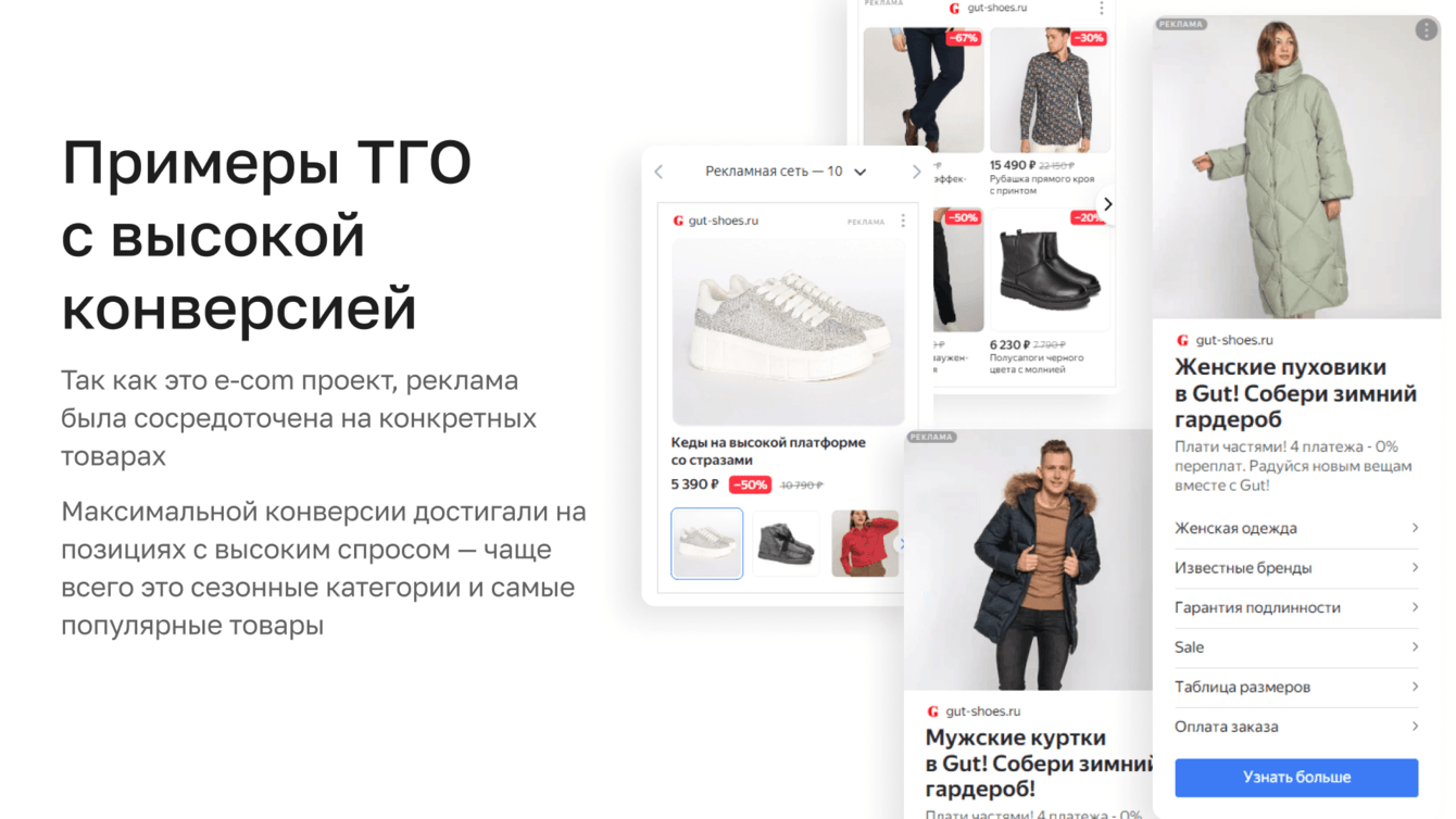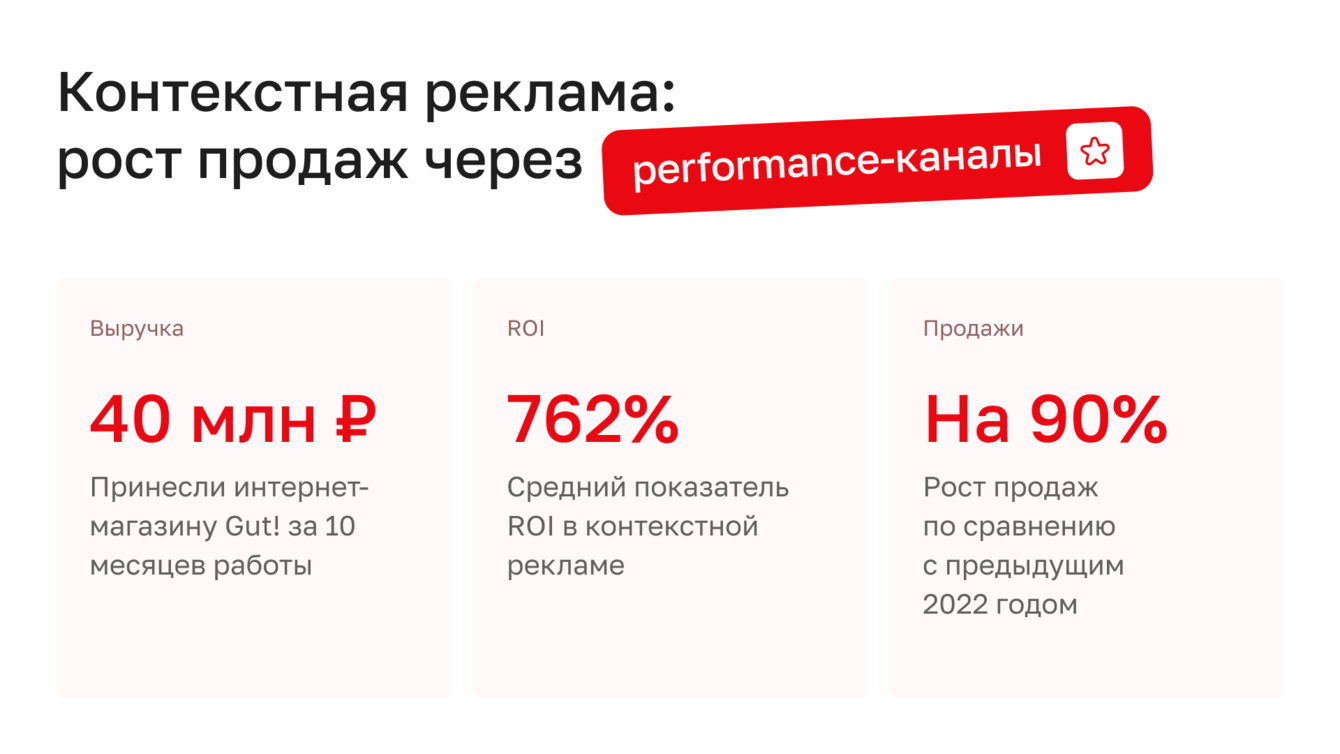 Принесли интернет-магазину свыше 40 миллионов рублей выручки. ДРР удалось держать на уровне 11-15%, а ROI в среднем составил 762%. В итоге объем продаж в интернет-магазине Gut! вырос на 90% по сравнению с предыдущим периодом.