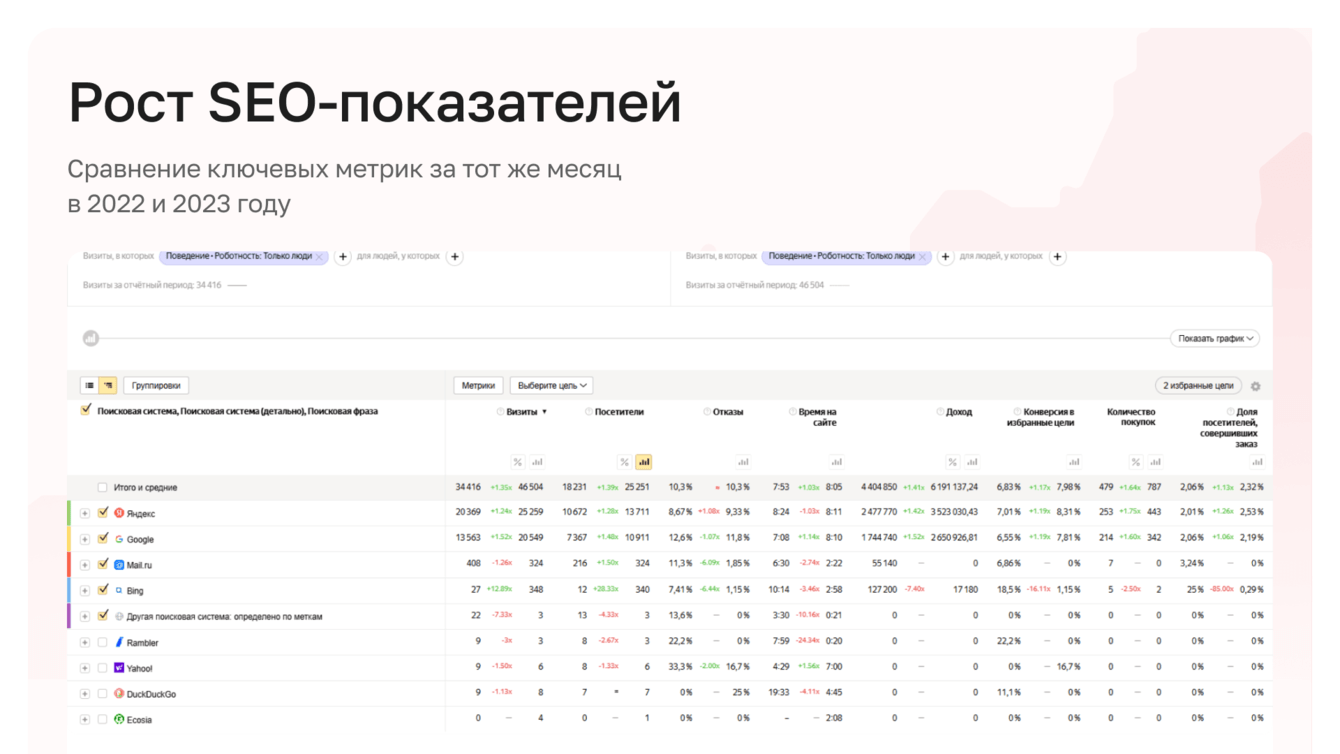 Случилась синергия: технические доработки сделали сайт удобнее для пользователей и повысили органический трафик, а реклама дала рост продаж за счет привлечения целевой аудитории.