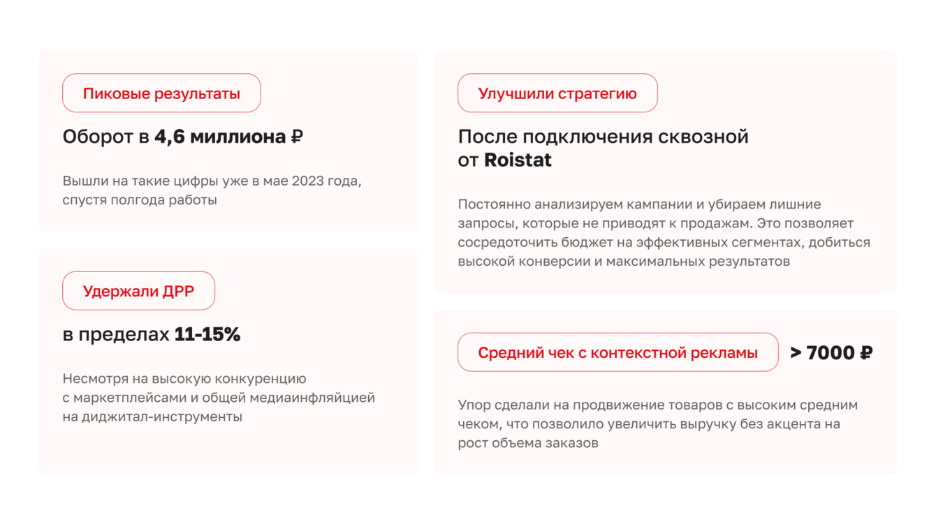 Дополнительно усилили продажи на маркетплейсах: добавили данные о покупках в рекламные кампании, это помогло увеличить конверсии. Выстроенную систему продолжили использовать и дальше в 2024 году.