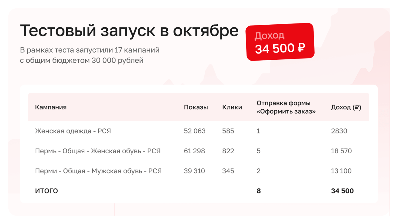 Первый запуск сделали на 30 000 рублей и получили такие результаты: