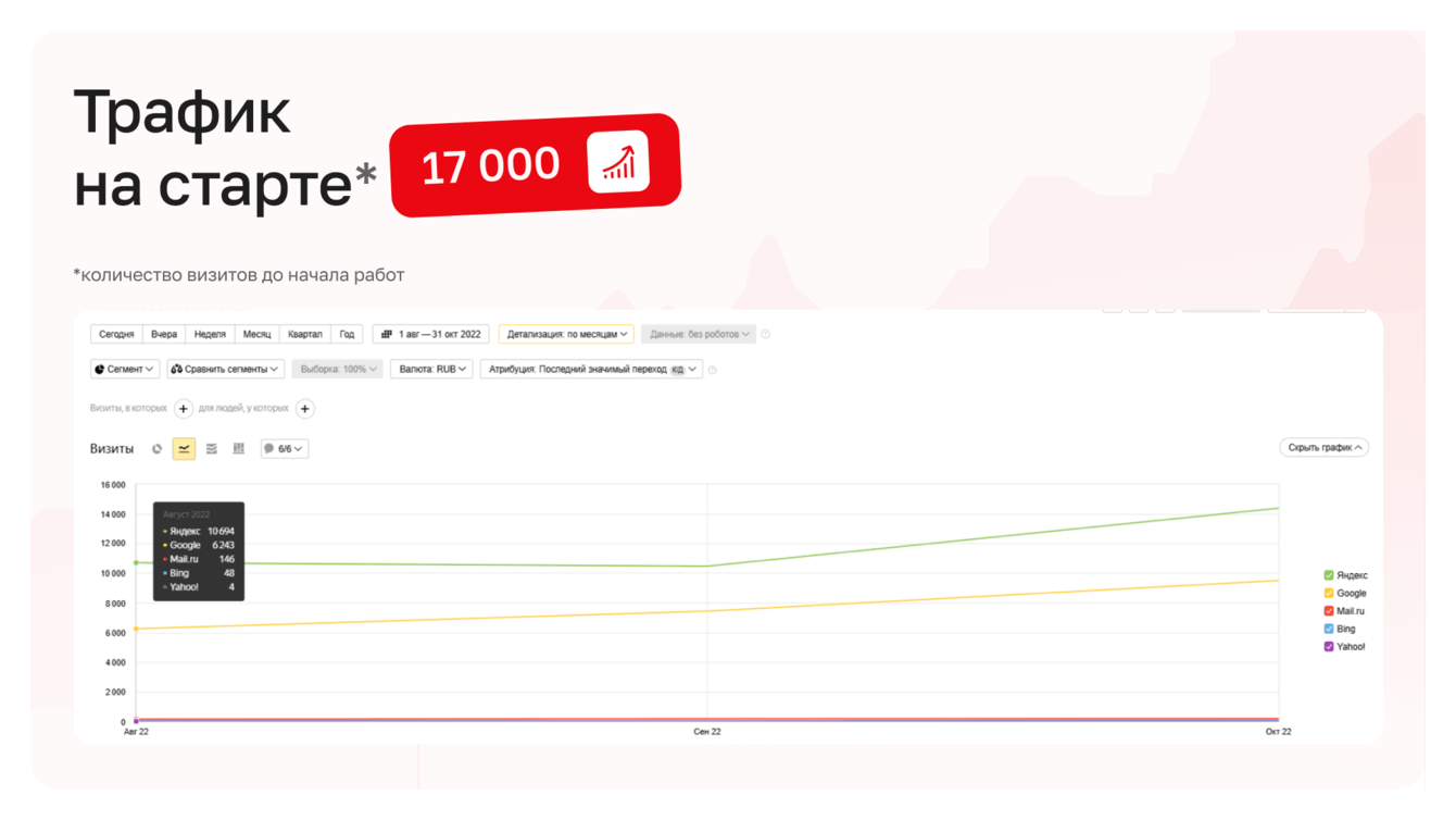 С этого момента начался этап, когда клиент уже увидел первые результаты от работы и понял, что хочет развиваться дальше. На момент старта работ посещаемость у сайта была в районе 17.000 посетителей в месяц.