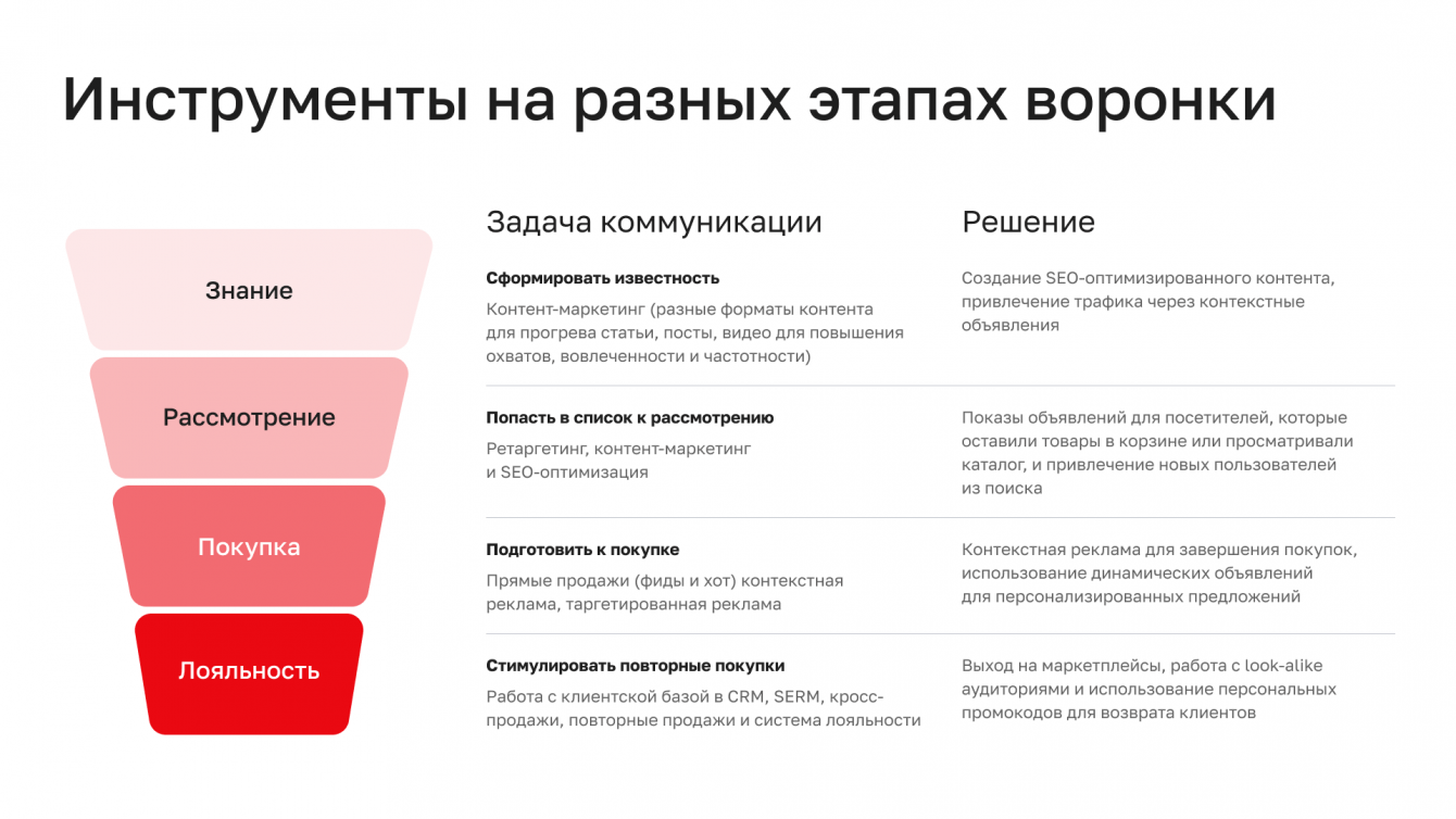 Так как задачи клиента включали несколько направлений: долгосрочные (масштабирование бизнеса) и краткосрочные (продажи в сезон), то работали сразу по всей длине воронки: