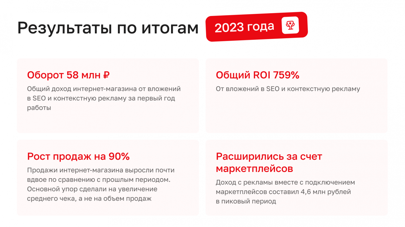 — Общий оборот интернет-магазина с SEO и контекста: 58 млн рублей за первый год работы.