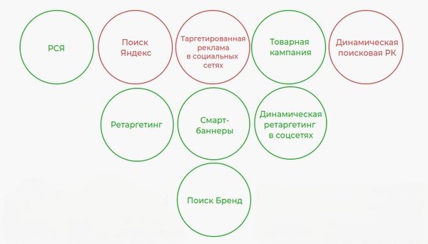 2. Для широкого охвата и первичных продаж были запущены: поисковая кампания, инамическая поисковая кампания, РСЯ, товарная кампания, таргетированная реклама в MyTarget и ВКонтакте.