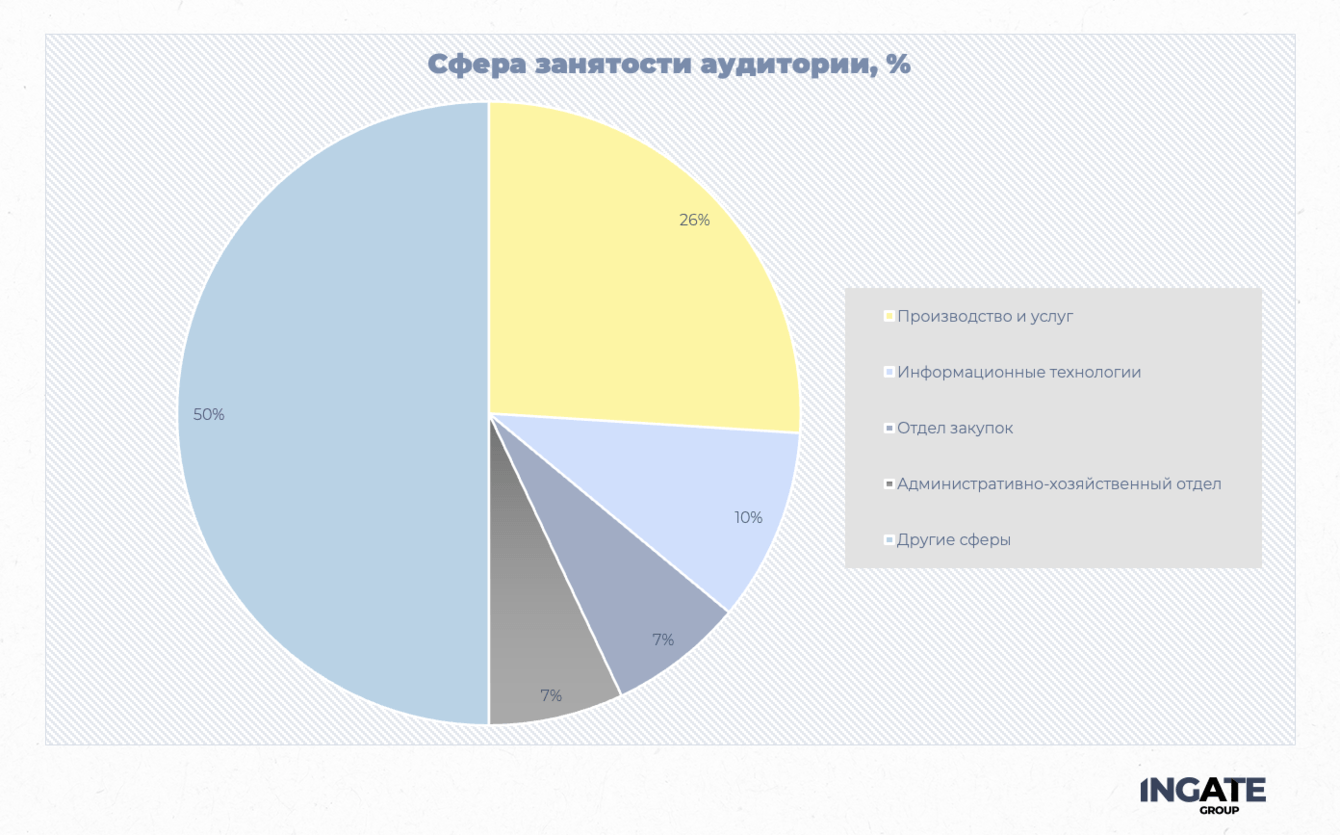 “Помимо этого, во время аудита кампаний и аудитории, мы обнаружили, что большая часть аудитории, приходящей по узким таргетингам, например, покупка продукции или поиск релевантных товаров, относится к сегменту B2B. Более 40% опрошенных пользователей осуществляют деятельность, направленную на взаимодействие с юрлицами.