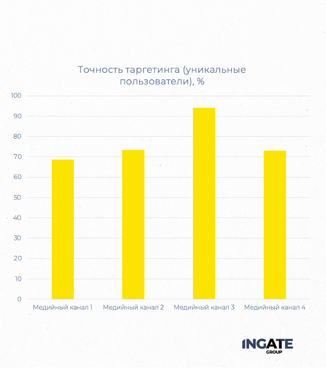 В результате мы увидели, что точность попадания в ЦА в разных каналах варьировалась от 68,6% до 94,2%.На основании этих результатов мы принимали решения о масштабировании тех или иных каналов. Это отличные показатели, подтверждающие, что проработка медийных платформ до запуска рекламной кампании — шаг, который позволяет минимизировать открутку бюджета на нецелевые каналы.