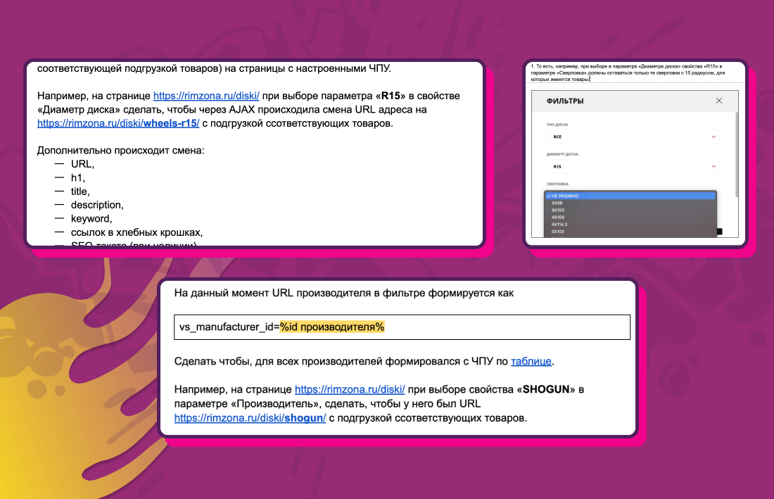 Например, при выборе параметра R15 в свойстве «Диаметр диска» через AJAX происходит смена URL на https://rimzona.ru/diski/wheels-r15/, и подгружаются нужные товары. Другие важные SEO-составляющие тоже меняются: h1, title, description, keyword, ссылки в хлебных крошках, SEO-текст. Сделали так, чтобы не генерировались страницы фильтров без товаров