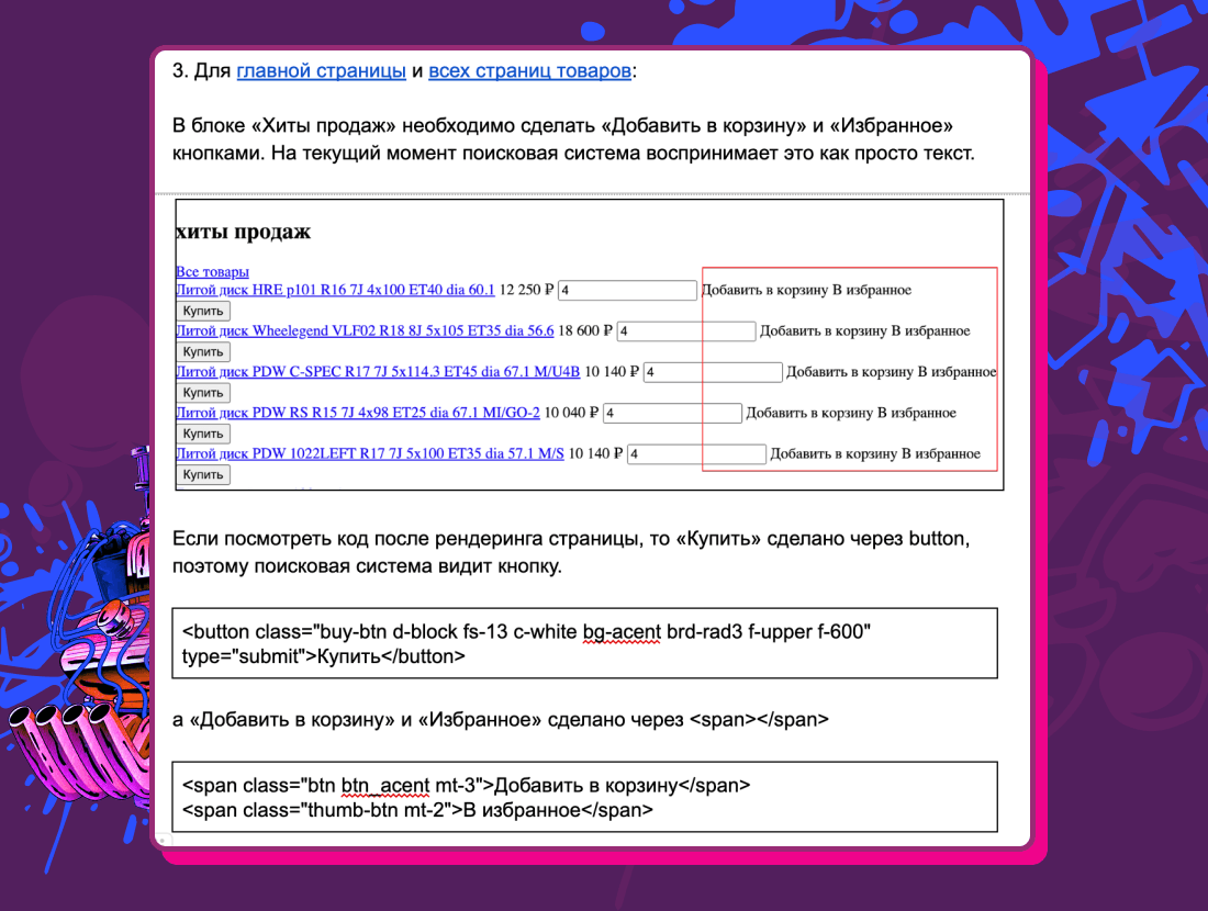 Сделали «Добавить в корзину» и «Избранное» кнопками. Раньше они были сделаны через span, поэтому воспринимались поисковыми системами как текст и иначе влияли на релевантность страницы.