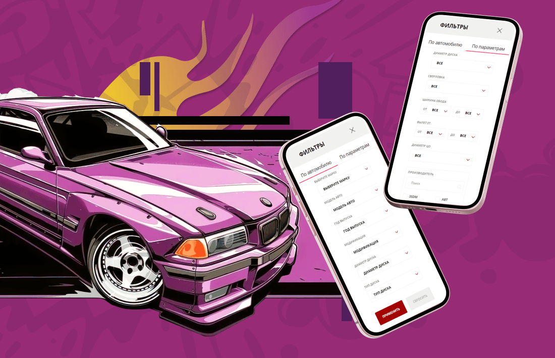 Порядок свойств при фильтрации по параметрам: производитель, тип, диаметр, сверловка. При фильтрации по автомобилю: марка, модель, поколения, тип.
