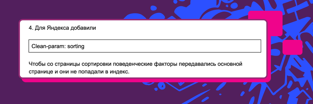 Провели техническую оптимизацию. Сформировали новый robots.txt — сделали отдельные правила для всех поисковых систем и для «Яндекса». Для «Яндекса» добавили директиву Clean-param с параметрами для исключения дублирующихся страниц с get-параметрами.