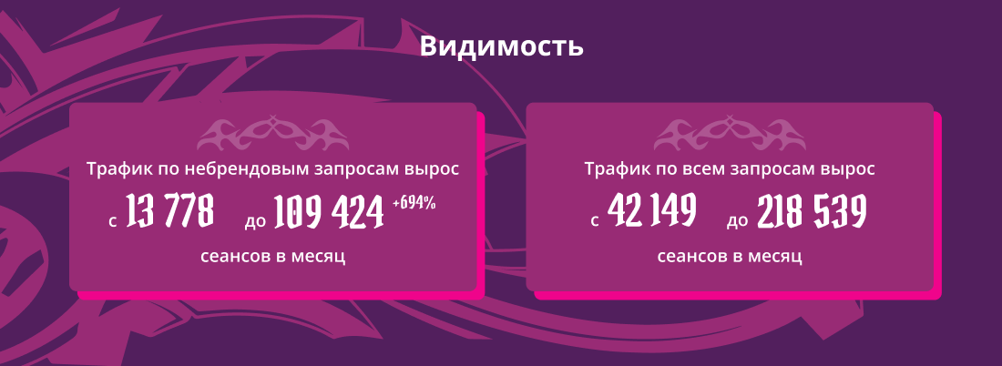 Благодаря этому мы получили в короткие сроки более 10 000 новых категорийных страниц, повысили видимость сайта в поиске и увеличили трафик в разы.