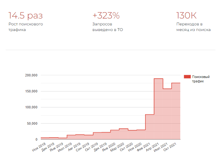 Сейчас посещаемость из поисковых систем достигла 130 398 переходов в месяц. Рост трафик составил 1445%