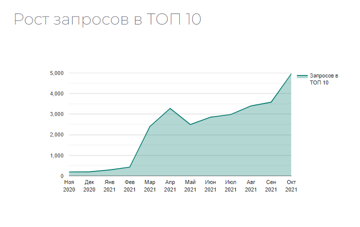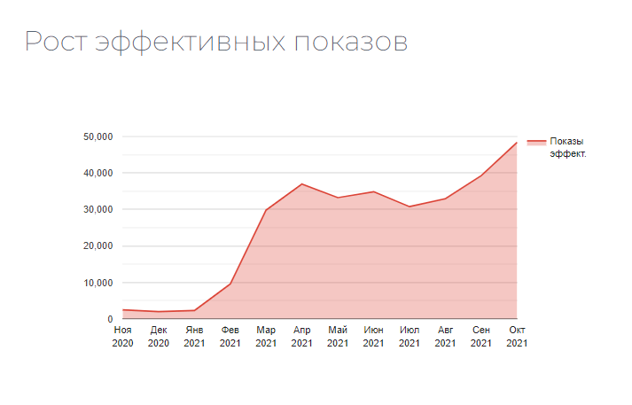 Количество запросов в ТОП 10 Яндекса выросло до 3 192 запросов на 323%, эффективные показы достигли значения в 34 855 показов