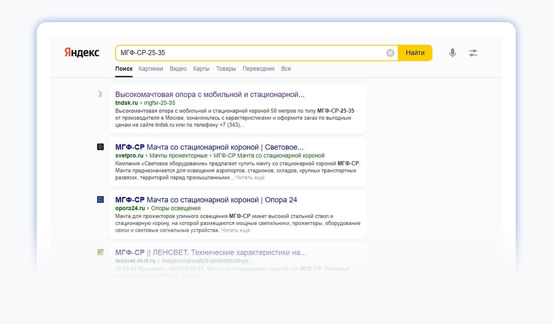 Результат оптимизации поиска по артикулам вы можете проверить сами. Например, найдите в «Яндексе» запрос «МГФ-СР-25-35» и точно увидите сайт нашего клиента.