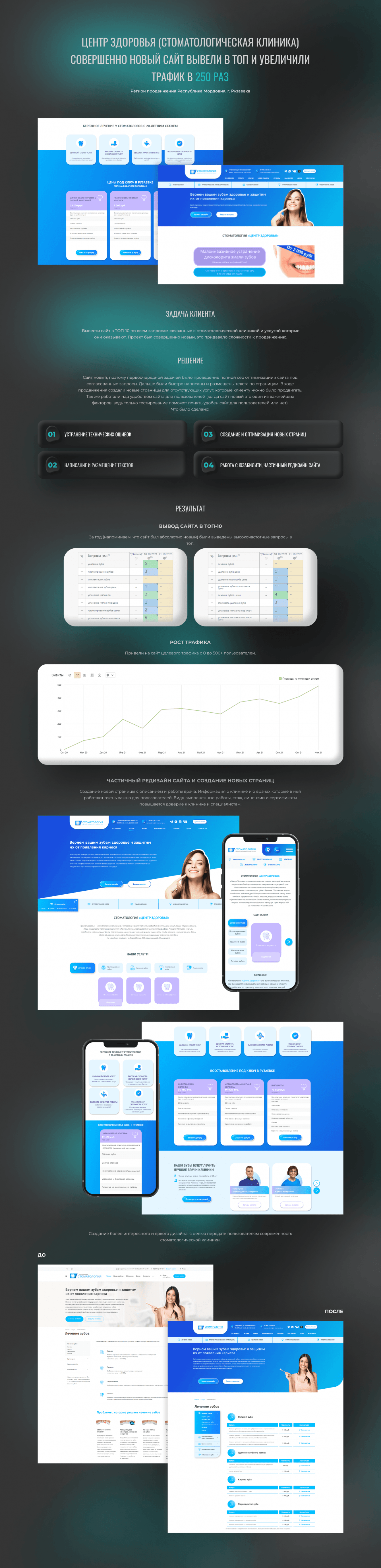 Вывести сайт в ТОП-10 по всем запросам связанные с стоматологической клиникой и услугой которые они оказывают. Проект был совершенно новый, это придавало сложности к продвижению.
