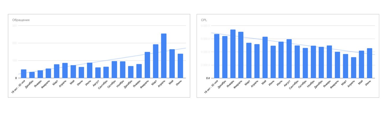 По графикам видно, что, например, в апреле — когда в нише стартует сезон — за год нам удалось увеличить количество заявок в 2,5 раза, а стоимость лида снизить примерно в 1,6 раза