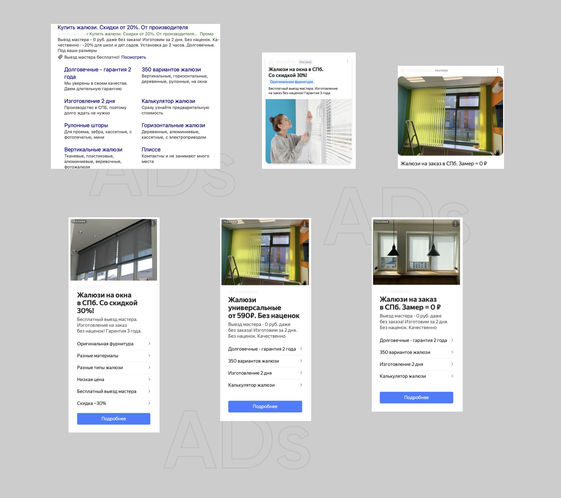 Покупатели жалюзи, как правило, принимают решение быстро. Как только появляется яркое солнце, они заходят в поиск, вводят запрос вроде «заказать жалюзи» и сразу оставляют заявку — именно таких пользователей мы и стремились перехватить.