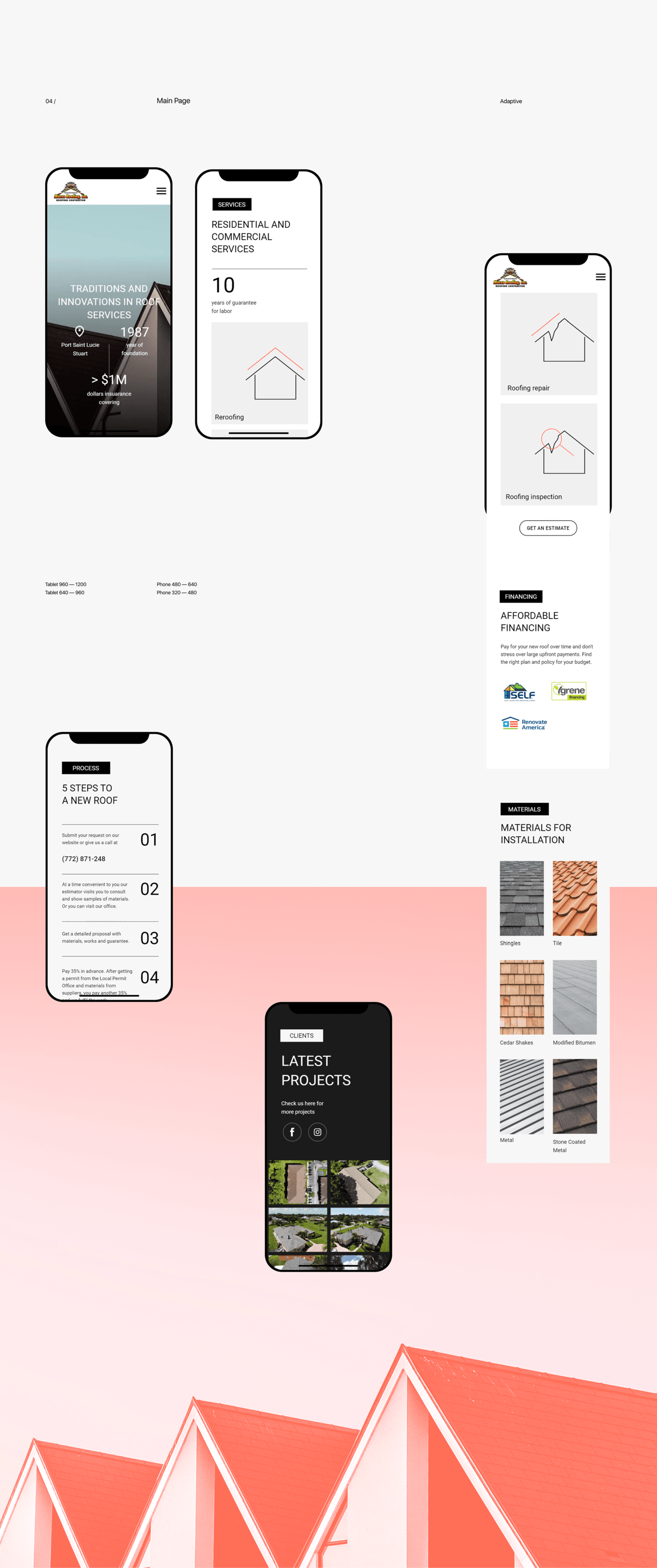 Клиентами компании являются, в основном, люди средних лет или в возрасте, также люди во Флориде привыкли, что не нужно напрягаться, чтобы найти уроки игры на гитаре или заказать ремонт крыши. На каждом сайте одинаковая структура, одни и те же фразы, кнопки обратной связи. Поэтому мы направили силы на создание лаконичного дизайна, не перегруженного информацией, который выделил компанию среди конкурентов