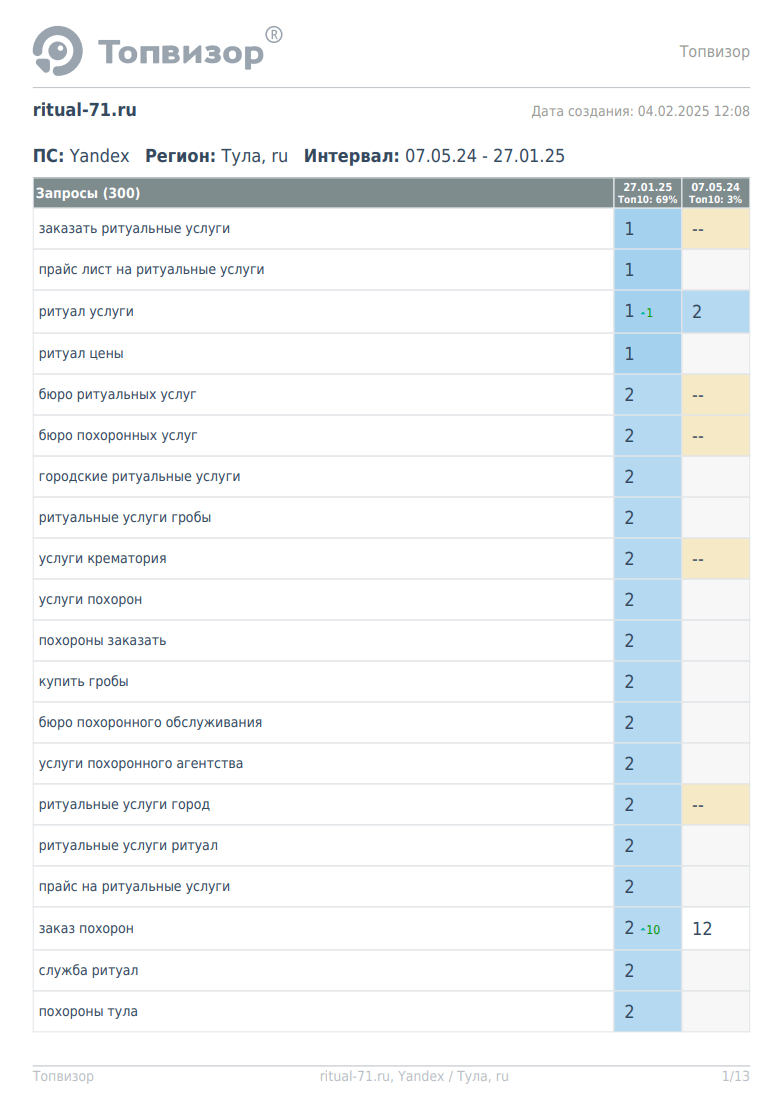 При составлении семантического ядра учитывались основные пожелания клиента, а именно подбор запросов направленных на увеличение видимости по ритуальным услугам. Для получения качественного ядра мы использовали такие сервисы как: