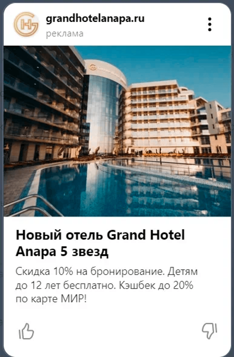 myTarget приносил больше лидов по адекватной стоимости, чем ВК, поэтому мы перераспределили бюджет в пользу этого инструмента. Но также оставили ВКонтакте, чтобы привлекать подписчиков в сообщество отеля в этой соцсети, размещать медийную рекламу (клипы и сторис) и использовать уникальные для ВК таргетинги — «путешественники», «активные в определенных сообществах», «используют мини-приложения по авиабилетам, броням отелей» и т.д.