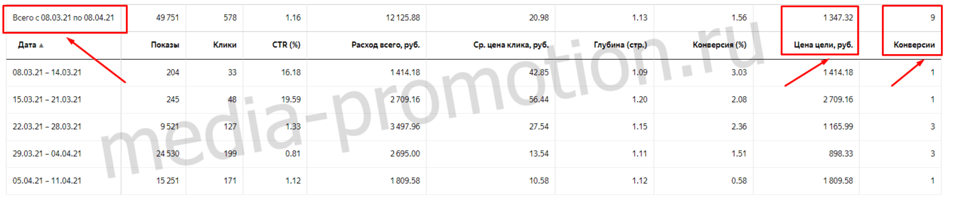Было до настройки с 8 марта по 8 апреля - 9 заявок по 1350 рублей.