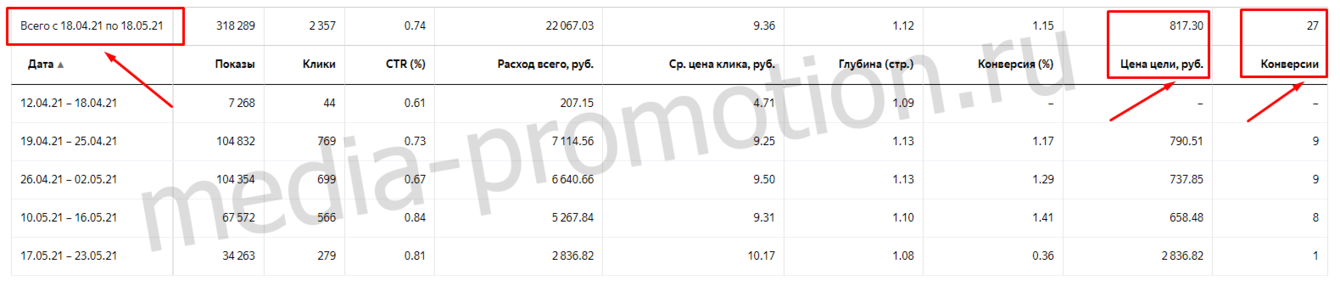 Спустя 10 дней после грамотной настройки рекламы Яндекс с 18 апреля по 18 мая на сайт пришли 27 заявок по 817 рублей. Проект себя окупил и оправдал ожидания клиента.