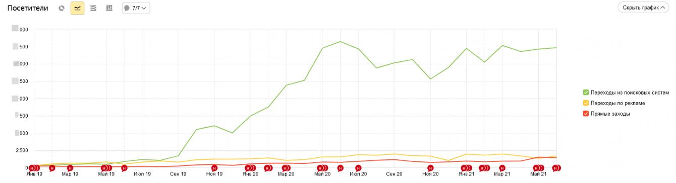 Подключили Yandex metrica, Google Analytics настроили цели, подключили CallTouch для отслеживания конверсий и расчета точной стоимости лидов по разным каналам трафика. Настроили webmaster.yandex.ru, google search console