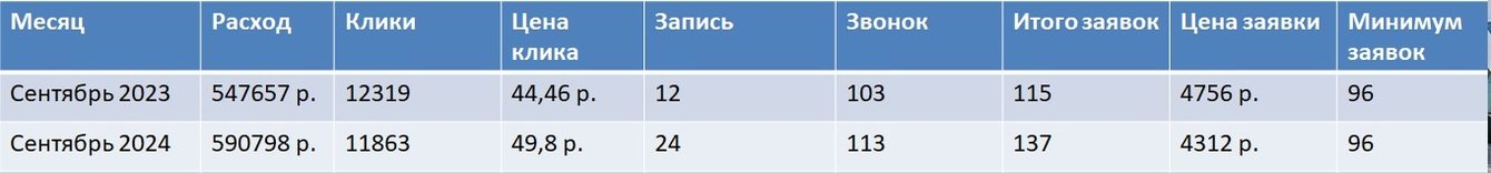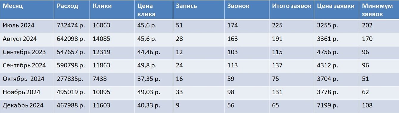 Данные за 2-ую половину 2024 года по рекламным кампаниям в Яндекс Директ. Минимум заявок — это цель, поставленная для нас по привлечению