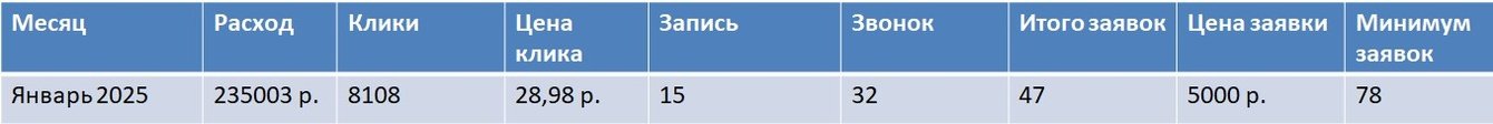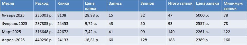 За первый квартал 2025 года количество кликов по рекламе увеличилось в пять раз, а цена за клик упала в четыре раза. Количество звонков выросло в три раза, общее количество заявок — тоже в три раза. Цена заявки упала более чем в два раза.