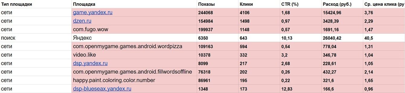 Анализ статистики РСЯ за определённый период показал, что на старте многие площадки были нерелевантны для привлечения заявок, поэтому их отключили