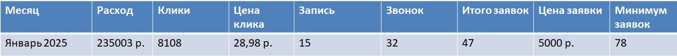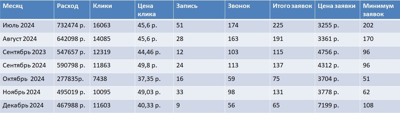 Данные за 2-ую половину 2024 года по рекламным кампаниям в Яндекс Директ. Минимум заявок — это цель, поставленная для нас по привлечению