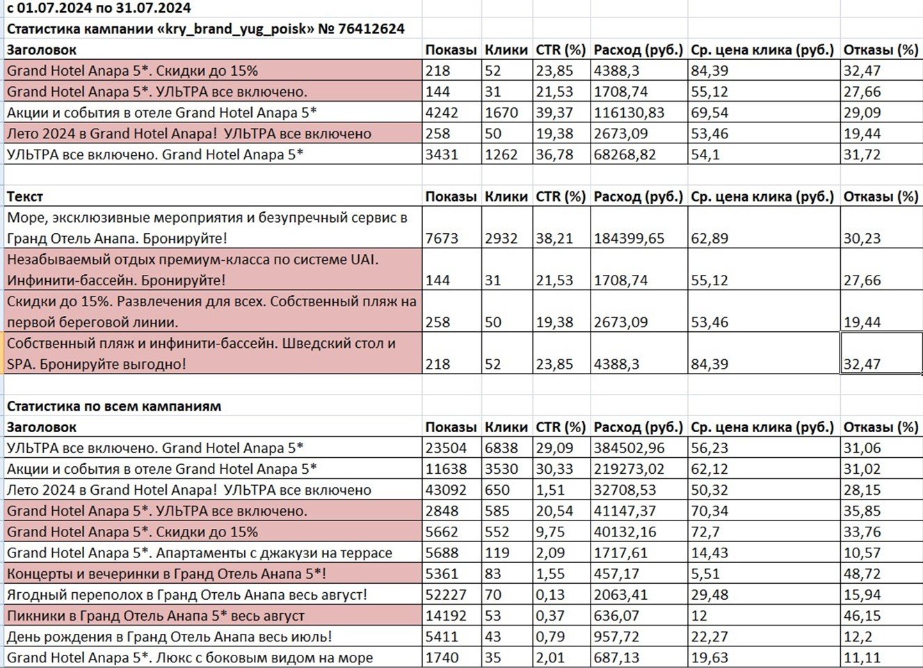 «Гранд Отель Анапа» 5* — пятизвездочный курортный комплекс на побережье Черного моря в Анапе. Бюджет клиента варьируется в зависимости от месяца или сезонности и составляет от 235 тыс до 800 тыс руб. в месяц. Цена заявки — от 3200 до 7000 рублей. Основная цель — обеспечить отель бронированиями на сезон.