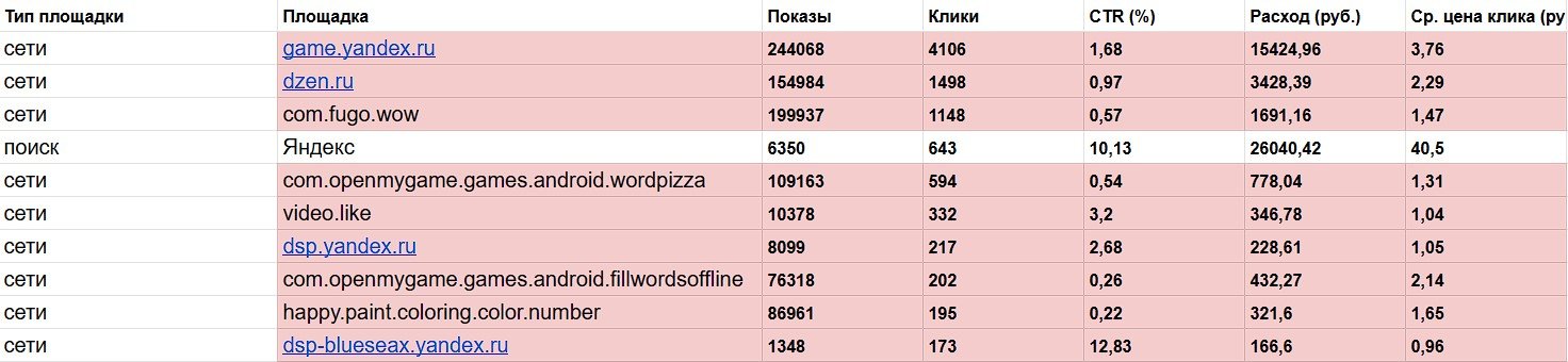 Анализ статистики РСЯ за определённый период показал, что на старте многие площадки были нерелевантны для привлечения заявок, поэтому их отключили