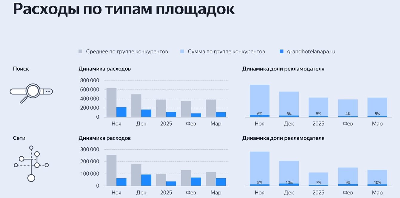 Сравнение с конкурентами в клиентской нише показывает, что на поисковую рекламу мы тратили в 5 раз меньше, а на рекламу в сетях — в 2–5 раз меньше. По доле показов среди рекламодателей мы занимаем 5–10% от общего объема конкурентов.