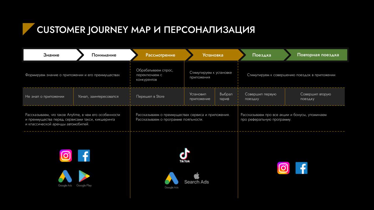 На первых этапах — «Знание» и «Понимание» — важно было рассказать пользователю о приложении, чтобы повысить осведомленность о бренде. Коммуникация: донесение информации о том, что такое Anytime, в чем его особенности и преимущества перед сервисами такси, кикшеринга и классической аренды автомобилей. Для продвижения использовали Google Ads, рекламу в Instagram* и Facebook*, а также в маркете приложений Google Play.