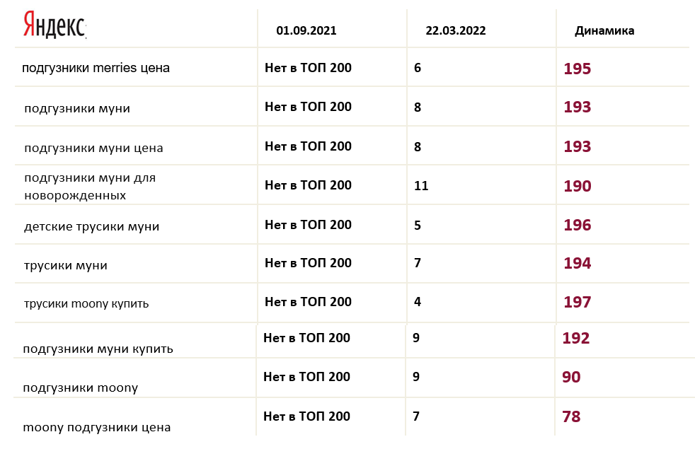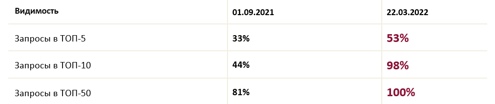 - Достигнуты лидирующие позиции по среднечастотным и низкочастотным поисковым запросам в нише.