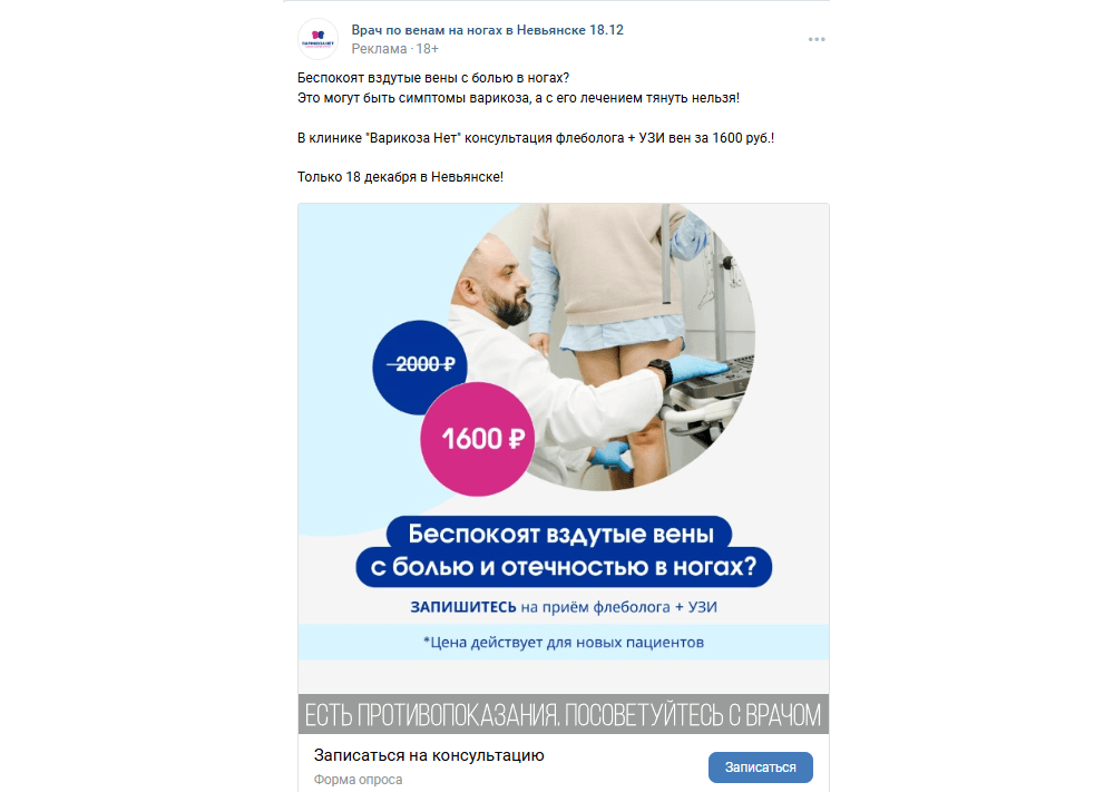 После обсуждения задачи с клиентом решено было рекламировать действующую акцию: если пациент записался на прием к флебологу, то получал УЗИ бесплатно.