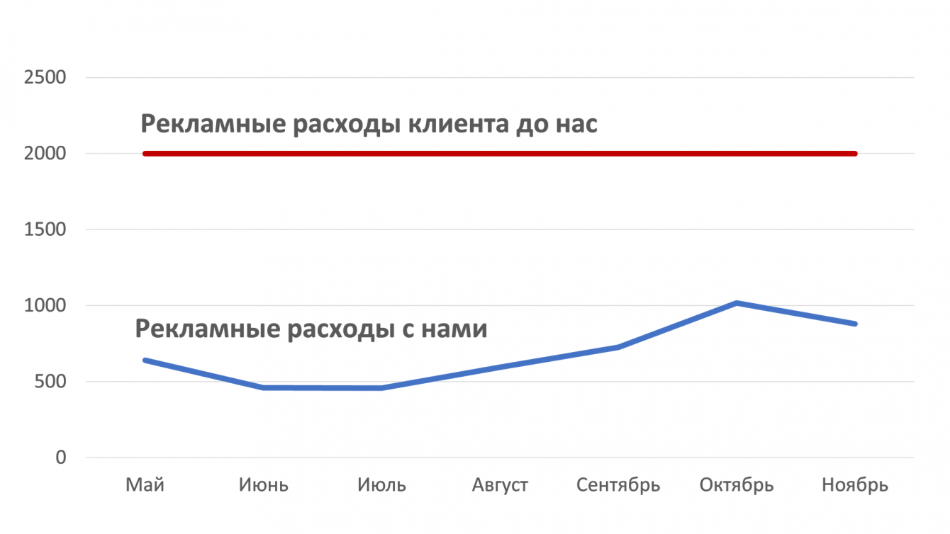Несмотря на временное падение по статистике, наши рекламные расходы были все еще в 2 раза меньше, чем у клиента до нас.