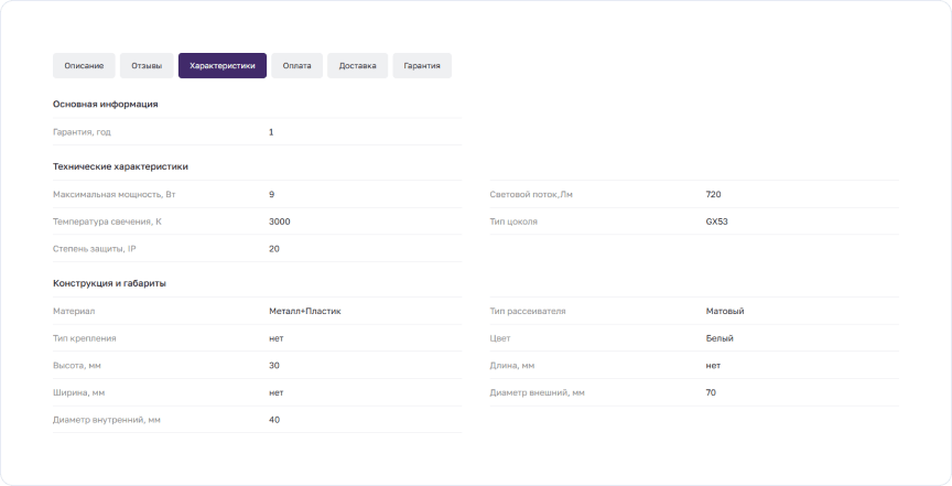 В карточке товара сгруппировали характеристики, чтобы информация воспринималась проще. Дополнительно разместили данные о доставке, оплате и гарантии — это позволяет пользователю принять решение без перехода на другие страницы.