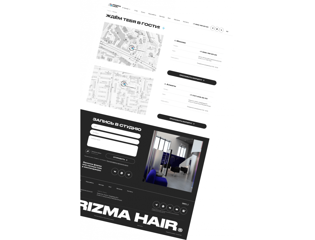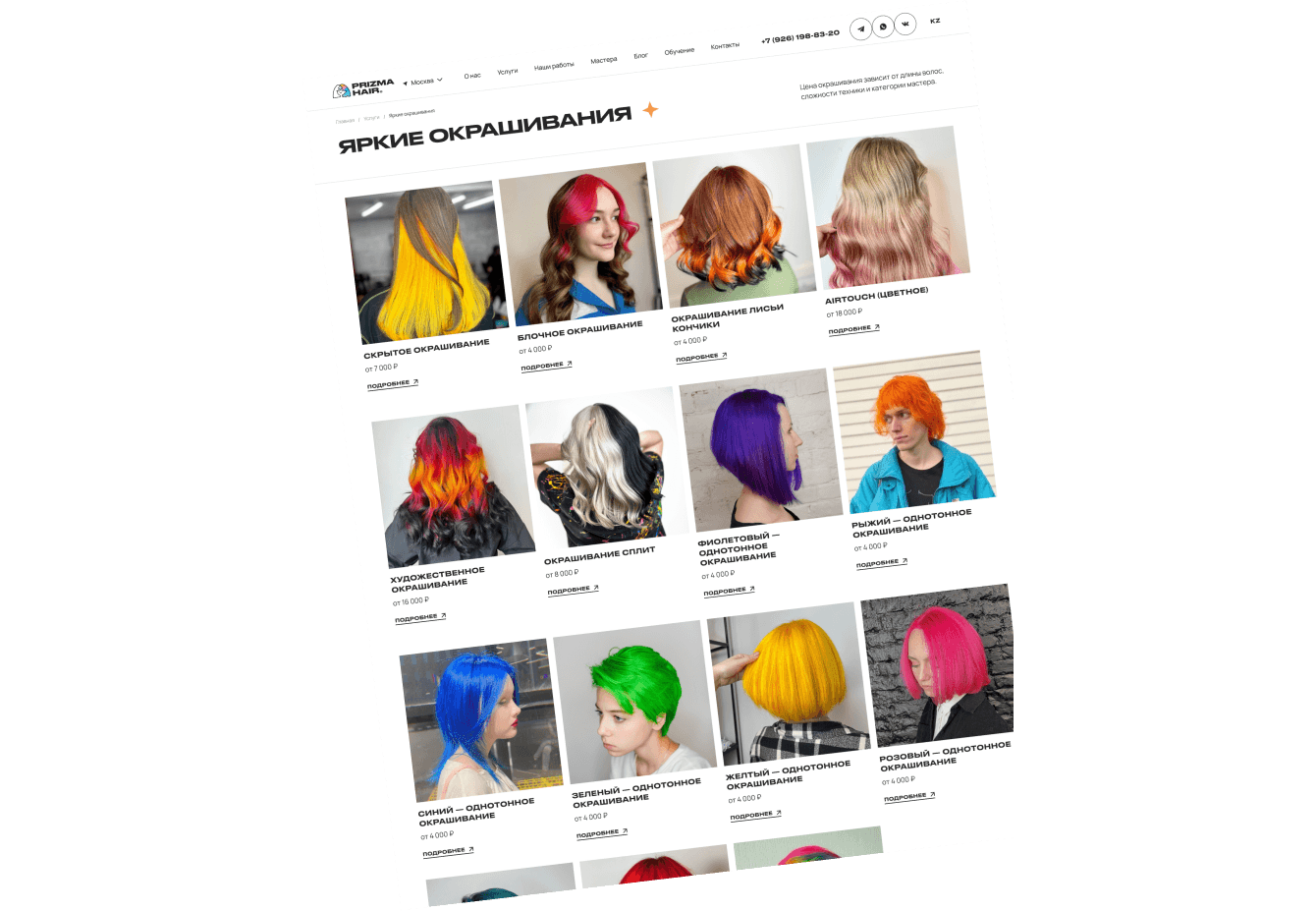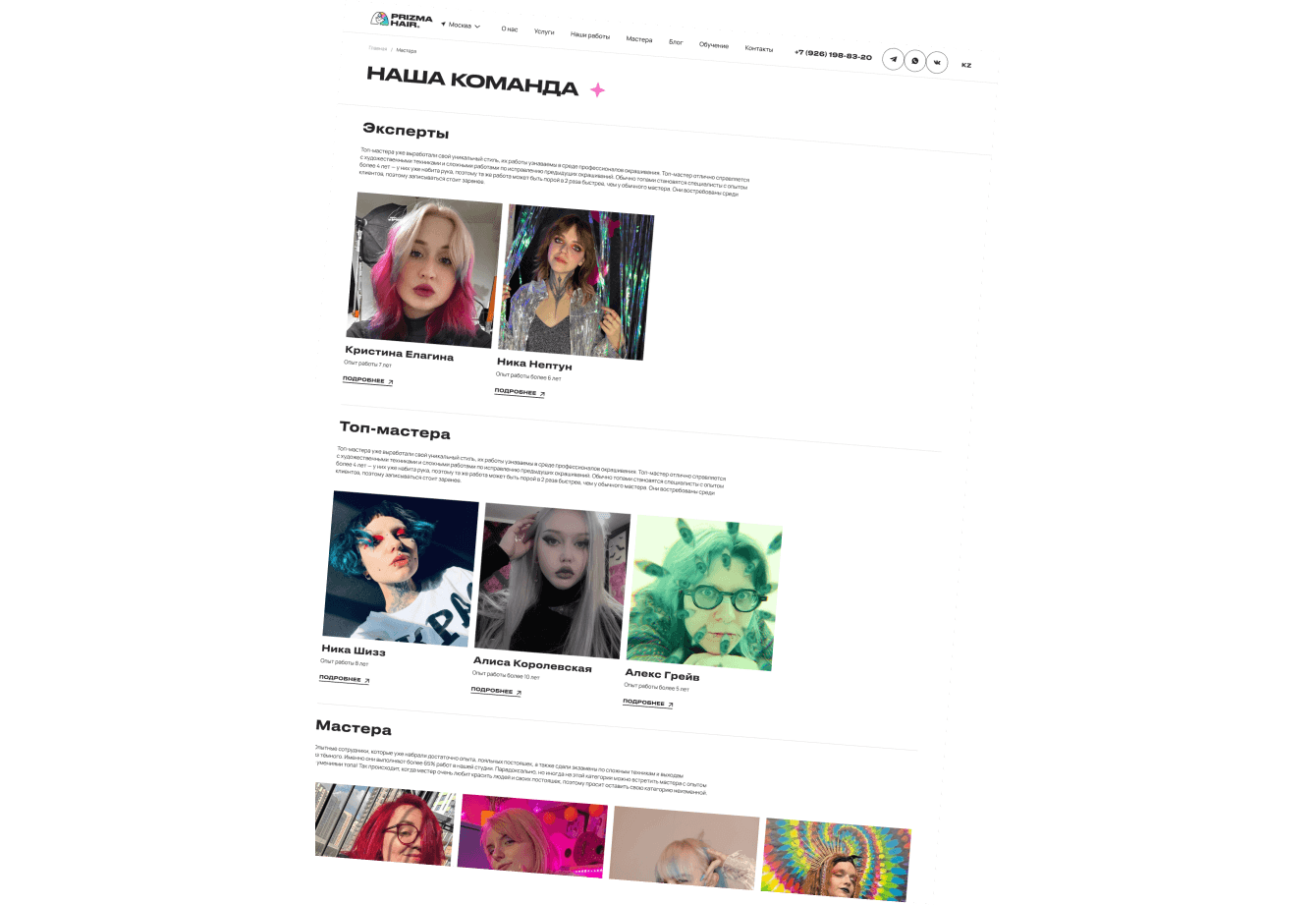 Созданный сайт для Prizma Hair — это полноценная платформа, предоставляющая полную информацию о студии, услугах и мастерах. Каждый элемент продуман для удобства пользователей, что делает взаимодействие комфортным и помогает бренду выделяться в сфере красоты и окрашивания.